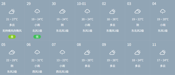 国庆节期间,全市最低气温13~23℃,最高气温22~31℃。天气以多云、小雨为主,自驾出游、探亲访友,车流密集,交通安全风险随之增加。交警部门特别提示:出行前请务必检查车辆(轮胎、雨刮、灯光),并提前了解天气路况;行车途中遇雨雾,请立即开启雾灯或近光灯,降低车速,加大跟车距离,避免紧急制动。愿您将平安掌握在自己手中,祝您假期旅途顺畅,阖家欢乐!